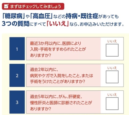 FWD富士生命ゴールドメディワイドでは、持病・既往症があっても3つの質問すべて「いいえ」であれば申し込める商品です。