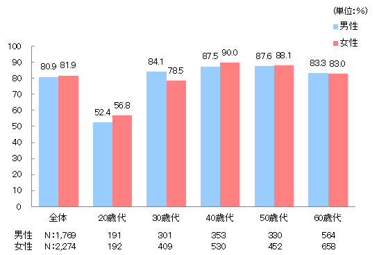 30代になると約1.5倍に加入率が倍増(男性84.1%、女性78.5%)になるところを見ると、20代の持つ保険に対する寄与度合いの低さが見てとれます。